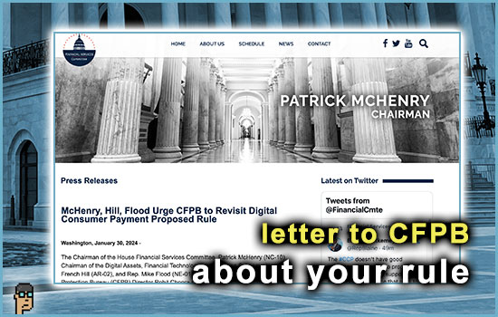 In a letter to the Consumer Financial Protection Bureau (CFPB) and Director Rohit Chopra (D), Republican House Financial Services (HFS) lawmakers urged the agency to reopen the comment period for the proposed rule (see it): “Defining Larger Participants of a Market for General-Use Digital Consumer Payment Applications.” Comments closed on January 8 and would impact digital wallets for crypto among other non-bank areas.